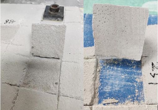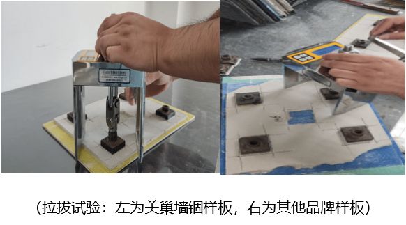 (拉拔试验结果:左-美巢墙锢样板本体破坏,右-其他品牌样板界面破坏)