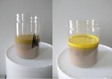 (同等重量界面剂,黄色原液渗透性对比:左一美巢墙锢全部渗入沙中)