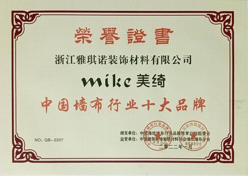 经过时间的洗礼,汗水凝练成了勋章。2022年伊始,美绮墙布就凭借极高的品牌美誉度和强大的品牌影响力,以及过去一年里出色的业绩表现和亮眼的形象展示,从一众墙布品牌中脱颖而出,喜提2021年“中国墙布行业十大品牌”荣誉称号,充分彰显了美绮墙布卓越的品牌实力和优良的市场口碑。