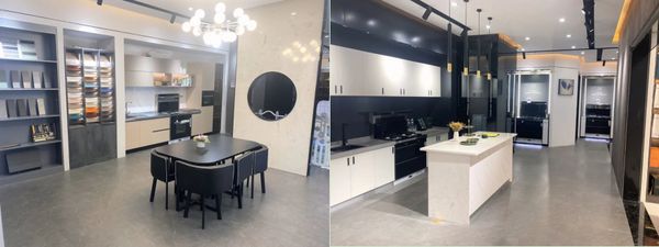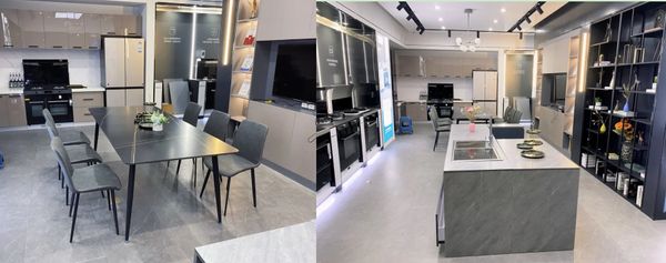 店内除了产品陈列区外也处处体现着森歌文化的独特风格。以灰黑为主色调,颇具质感的大理石和桌椅,简约、典雅。