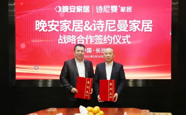 2021年12月30日上午,晚安家居与诗尼曼家居战略合作签约仪式在晚安家居文化园举行。双方就联合研发、运营、营销、共同创新打造整家定制全案营运模式正式签署战略合作协议。