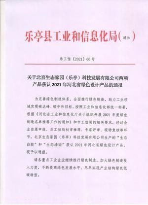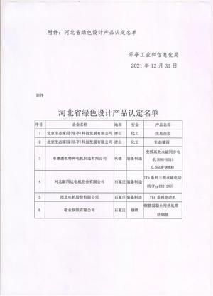 为加快建设绿色制造体系,助力工业领域实现碳达峰、碳中和目标。,根据《河北省工业和信息化厅关于组织开展2021年度绿色制造名单推荐工作的通知》和市工信局相关要求,我司在河北省绿色制造体系项目申报中,经过自愿申报、初审推荐、专家评审、现场复核,拟定名单公示等环节均符合要求,荣获“生态白胶”和“生态墙固”两项绿色设计产品的殊荣。