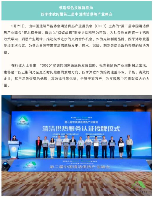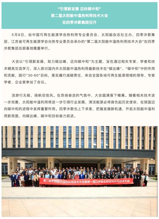 近日,四季沐歌公布企业2021年度总结,其中值得关注的企业大事件有四季沐歌高效大平板集热器通过欧洲Key Mark国际认证、召开第二届太阳能中温热利用技术大会、上市九周年等等。