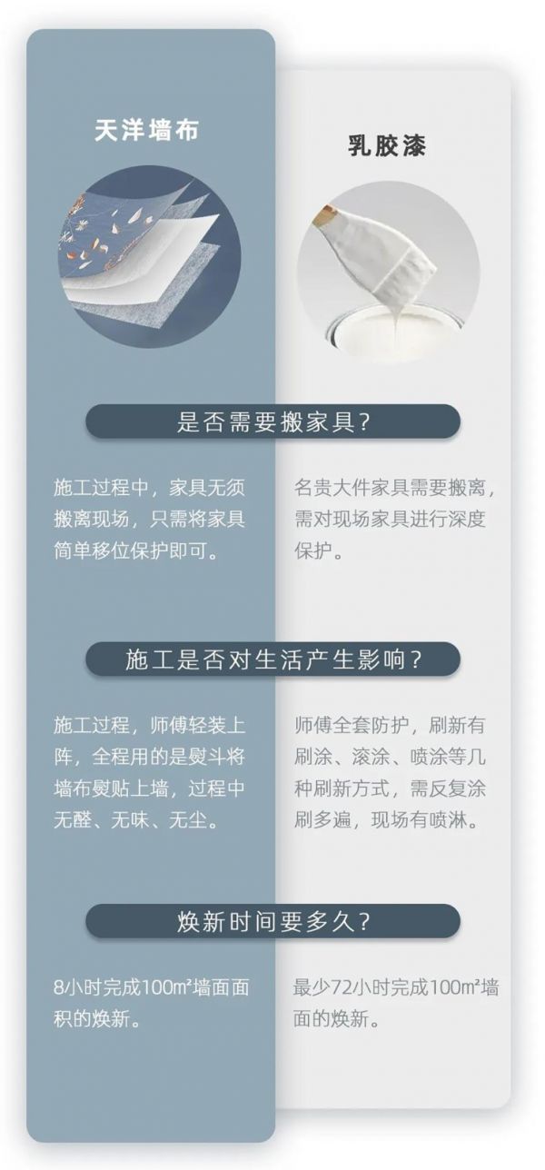 我们接触了很多顾客,他们在选择焕新服务时会纠结产品之间的差异性,今天就从焕新的施工服务方面,分析天洋墙布和乳胶漆的差别,让大家更具体感受天洋墙布【不用搬家】焕新家的魅力所在。