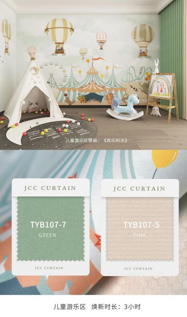 这是谢娜家儿童房的游乐区,原本大白墙的墙面很单调,没有童趣感。产品上选择了游乐园元素的《欢乐时光》,清新淡雅的色彩,充满童趣的图案,搭配活泼的绿色系拼色窗帘,轻松营造出一个快乐的成长乐园。整个焕新过程无醛、无尘、无味,母婴安全。