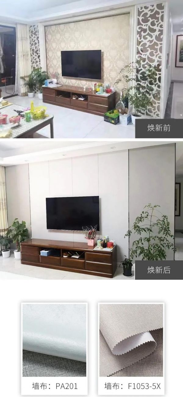 顾客5年前的装修,那会不懂装修,把家交给了装修的全包公司,如今这种风格已经被淘汰,现在想要按照自己喜欢的风格去焕新,再三对比下,最终选择了天洋墙布不用搬家的焕新服务,顾客对天洋墙布提供的评估、拆旧、设计、安装服务很满意。整个背景墙摒弃原有的古老、呆板设计,在墙面做了硬包处理,用金属边框重塑空间的高级感,产品选择细腻肌理感墙布,内敛的高级灰和高洁的米白色协调,释放空间的淡雅脱俗感。
