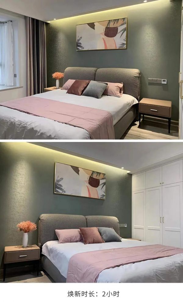 客户买的新房,觉得卧室是个每天与自己独处的重要空间,大白墙乏味,墙漆很难装出温暖感,在设计师的建议下,选择改变下卧室床头背景墙,用出挑的材质与颜色组合往往能带来出众的视觉效果:墙面选择带斑驳肌理的墙布,触感温柔,直抵人心。典雅的瓦松绿与豆沙粉、灰白色系家居搭配,窗帘选择轻奢感十足的深灰色绒布,整个卧室给人的感觉既温馨又有格调!只要保证墙面的平整,就可以进行天洋墙布的施工,整个卧室的焕新时长仅仅只要2小时。