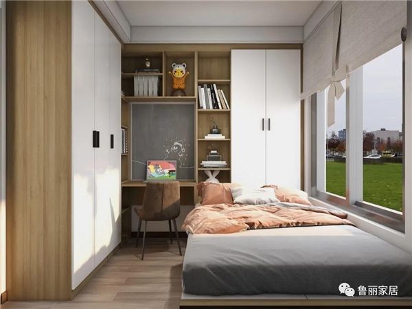 功能与颜值的相映衬可以为空间带来更多的惊喜体验。鲁丽家居设计师在设计女孩房时便充分考虑这一层面,将空间转角区域充分利用,在两侧衣柜拐角处做书桌设计连成一体,整体空间温馨舒适又不失功能性,非常适合想要拥有多重功能的小空间。