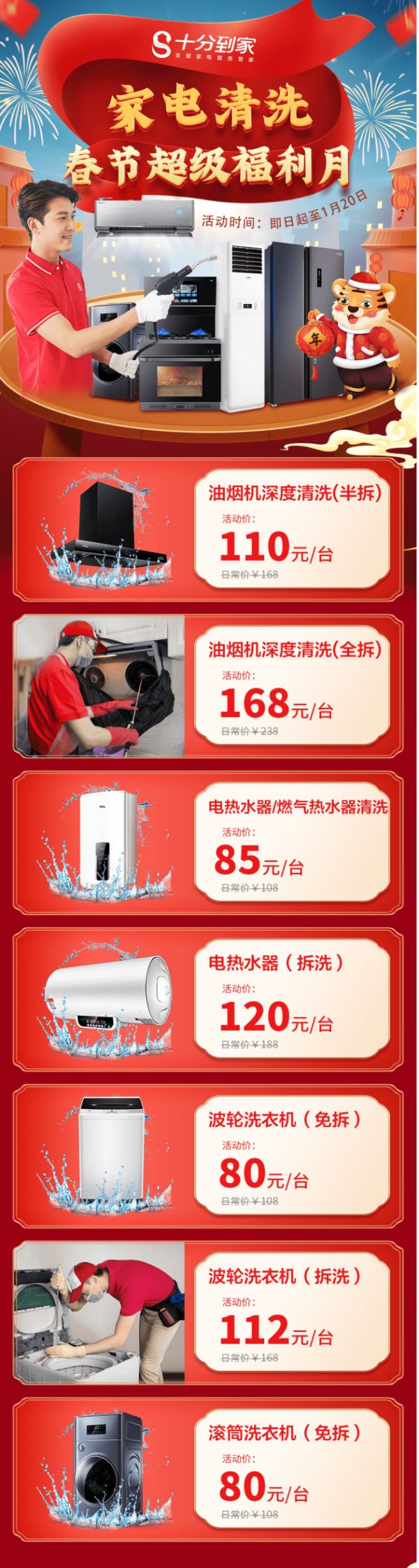 本次家电清洗新春福利活动不限品牌、不限品类,仅限时间!优惠将持续到1月20号,家里家电久未清洗的朋友切勿错过。关注十分到家公众号,在子菜单栏中即可找到「元春特惠」-超值清洗专栏即可下单哦。