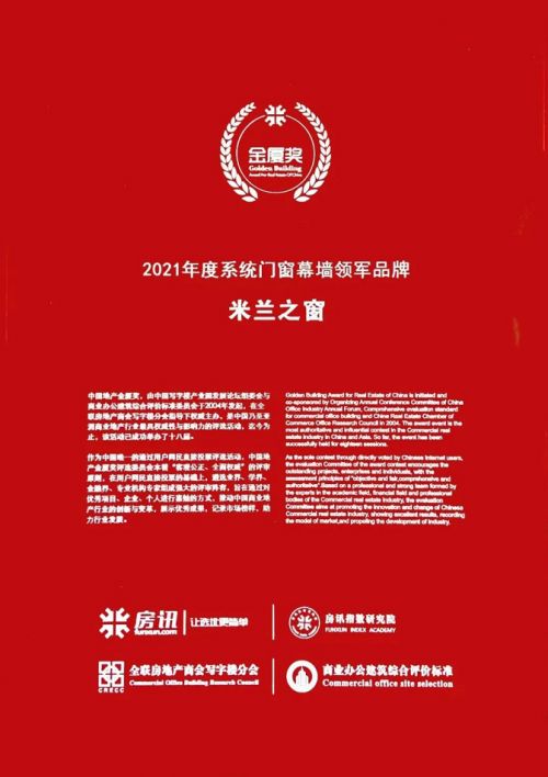 此次荣获中国地产金厦奖——“2021年度系统门窗幕墙领军品牌”,离不开各界对米兰之窗的认可与支持。荣誉与责任并行,未来米兰之家将持续致力于树立中国系统门窗行业标杆,引领行业发展,为推动中国房地产良好发展作出更大的贡献。