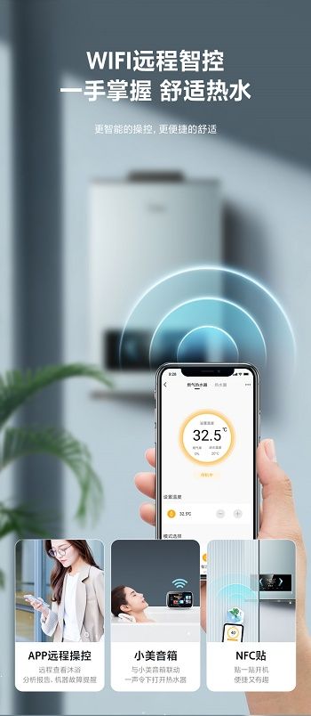 不止如此,美的HL6恒温王热水器还可联动小美音箱,沐浴只需开口,一声令下即刻享受美好泡泡浴,伴随美妙的音乐声放松身心,即便对智能产品陌生的老年人也可便捷省心地使用。产品自带NFC贴,消费者能通过手机“碰一碰”的方式进行交互,解锁更多操控方式。