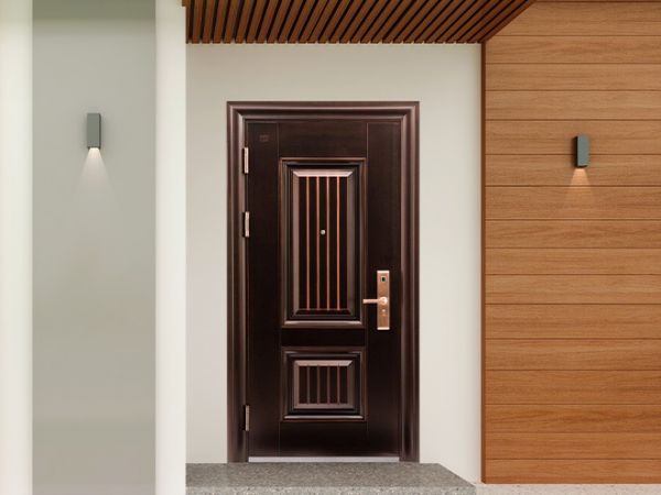 棕红色的大门配上我家的白色外墙,给人一种强烈的封闭感,门内和门外,似乎是两个平行世界,互不关联。门的中央是一大一小的内凹矩形图案,每个图案上都有几道白色竖线,这种设计使整个防盗门看起来非常的厚实,给人以一种坚不可摧的感觉。就外型上而言,这款防盗门并不出彩,但却很质朴,而我就喜欢这种质朴的感觉,它会让人很踏实。