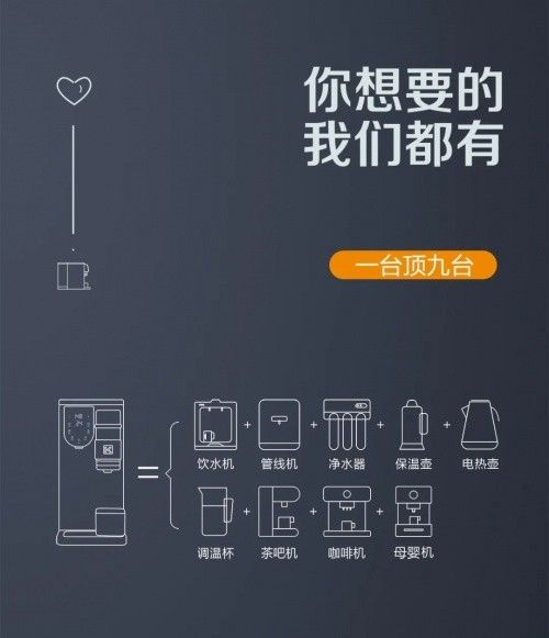 它是可移动的净水器,也是线管机、饮水机、保温壶、电热壶、调温杯、茶吧机、咖啡机、母婴机,九大功能集于一体,既节省了空间,又改变了生活,一举两得。