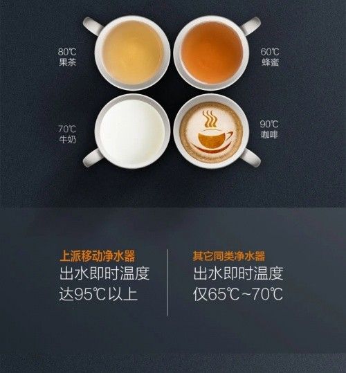 上派多功能移动净水器拥有令人叹为观止的3秒速热,出水即时温度高达95℃以上,常温~100℃任意精准控温,热水随需随取。