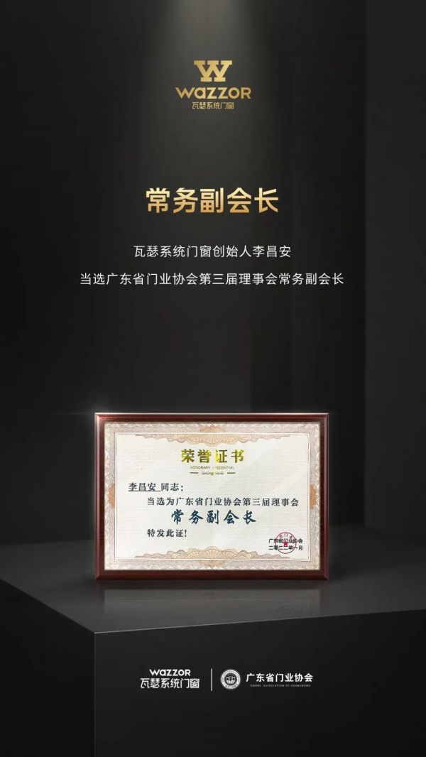 在第三届广东省门业协会换届大会上,经现场无记名投票,瓦瑟系统门窗凭借强劲的实力和对行业的贡献力及影响力,获得“广东省门业协会第三届理事会常务副会长单位”殊荣,瓦瑟董事长李昌安当选“广东省门业协会第三届常务副会长”。