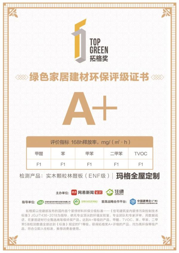 玛格全屋定制实木颗粒林醛板(ENF级)荣获拓格奖“A+”,意味着达到了目前最高水平的环保标准。家庭装修全部采用拓格奖“A+”评级产品,可实现装修后空间环保达标,符合健康入住标准。