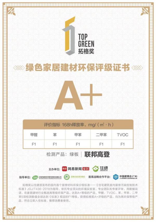 联邦高登绿板荣获拓格奖“A+”,意味着达到了目前最高水平的环保标准。家庭装修全部采用拓格奖“A+”评级产品,可实现装修后空间环保达标,符合健康入住标准。