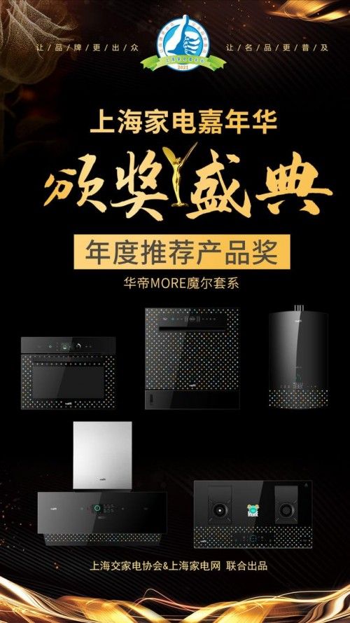 经过层层甄选,大会上正式揭晓了由协会专家及上海家电网共同评选出的多款2021年度卓越家电产品。其中,华帝魔尔More套系凭借独特的美学设计和卓越的产品性能脱颖而出,荣获“2021年度推荐产品奖”。