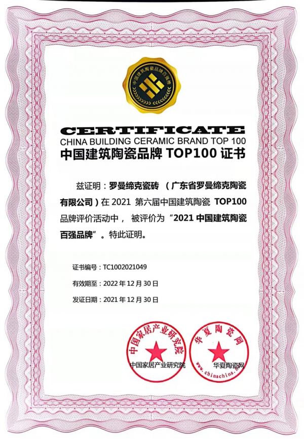 陶卫快讯|罗曼缔克荣获「中国建筑陶瓷品牌TOP一百」殊荣