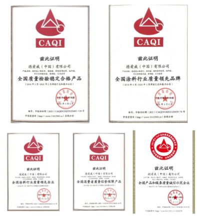 专注建筑涂料近百年,德爱威涂料在科技研发、产品创新、专业服务等方面屡创佳绩,载誉前行。2021年,德爱威涂料可以说是拿奖拿到手软。如在中国质量检验协会主办的2021年“3•15”国际消费者权益日和“产品和服务质量诚信承诺”主题活动中,德爱威荣获“全国消费者质量信誉保障产品”、“全国质量检验稳定合格产品”、“全国涂料行业质量领先品牌”、“全国涂料行业质量领先企业”、“全国产品和服务质量诚信示范企业”五项荣誉。而2021年中国国际涂料大会上,德爱威以雄厚的品牌实力以及良好的市场口碑,荣获“中国涂料行业十三五高质量发展企业”荣誉称号。而这些荣誉都仅是2021年德爱威涂料已斩获奖项的冰山一角,足以证明其在行业中的地位。
