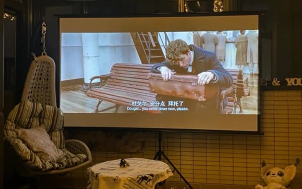 既然要体验影院氛围,并且契合阳台空间,推荐显示设备是投影仪十分恰当,不仅体积小不占空间、摆放简单超大屏体验、功能多、氛围感十足;