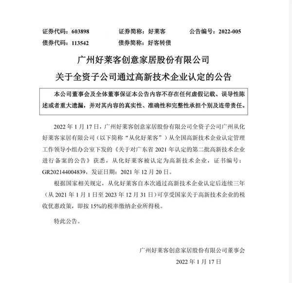 新浪定制频道讯 1 月 17 日,广州好莱客创意家居股份有限公司全资子公司广州从化好莱客家居有限公司从《关于对广东省 2021 年认定的第二批高新技术企业进行备案的公告》获悉,从化好莱客被认定为高新技术企业。