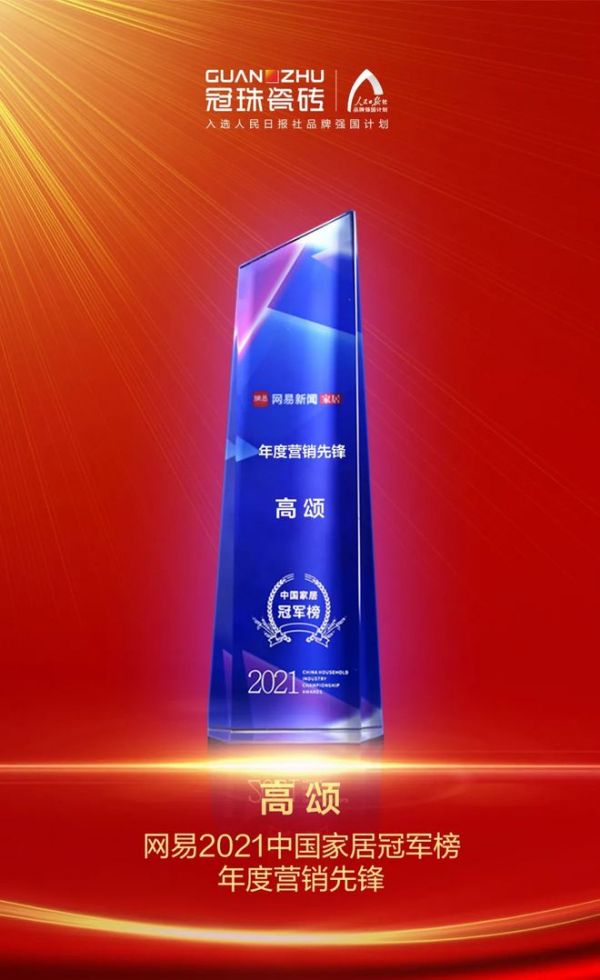 冠珠瓷砖,作为国货品牌进阶的营销典范,以榜样之力量,推行业之发展。凭借成熟的社会化营销策略,揽获消费者喜爱口碑,荣获网易颁发的“2021中国家居冠军榜行业领军品牌”、“2021中国家居冠军榜年度营销先锋”奖项。