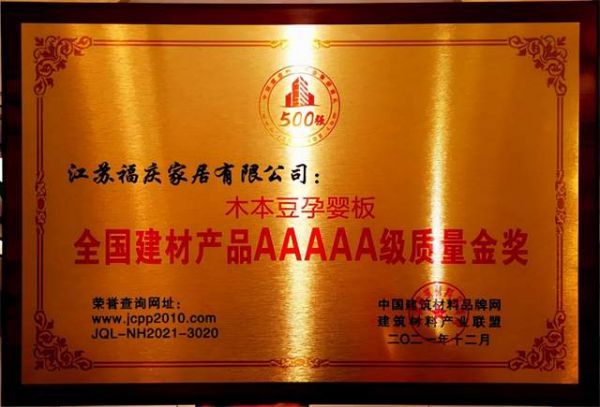 本次大会邀请了全国各大材料企业参加,经过层层筛选,最终选出代表性企业。而经调研组进行数据调研和市场调研结果考量,福庆孕婴板也凭借优良的产品质量、性能及口碑,斩获“全国建材产品AAAAA级质量金奖”!