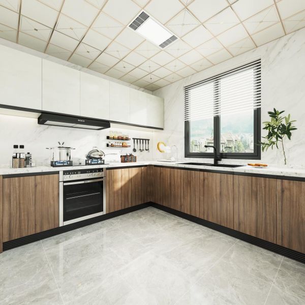 厨房作为“潮湿重地”,在地砖的选择上应优选高耐磨性、高防滑性的通体砖或防滑砖,它们表面不上釉,质地更为坚硬,能防止厨房地面过滑而摔倒。而在厨房墙砖的选择上,要选择防污性强、防渗透强的釉面砖,这样即使有油污附着于表面,用湿抹布轻轻一擦便能干净如初。YOYO提示,马赛克墙砖不适合厨房,因为每块砖的面积较小,铺贴完之后,会留出很多缝隙,容易藏污纳垢,不便清洁。