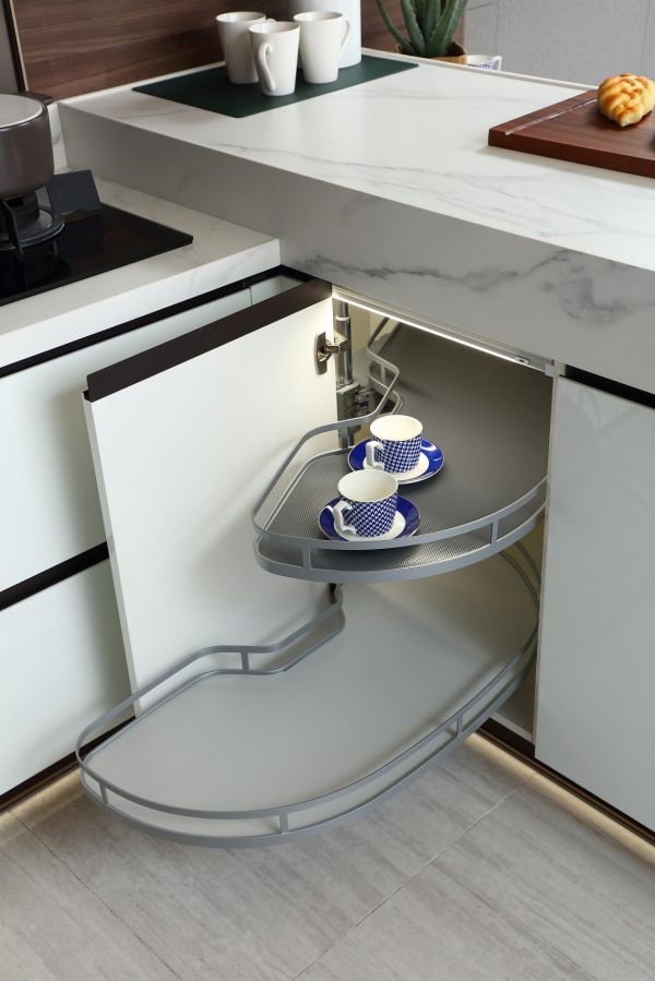 在地柜的转角处使用转角拉篮,不仅抽拉方便,还能最大化利用空间储物,让这个原本鸡肋的空间,也能派上大用处。