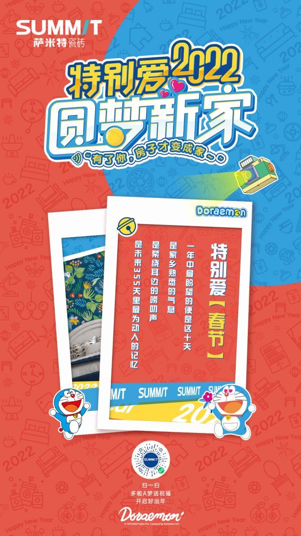 同时也期待着爱的“回声”,无论是准备踏上归途、或是决定留守过年,无论是衣锦荣归故里、或是遗憾折戟返乡,期待无分大小、「萨米特瓷砖」愿意聆听每一份“特别的想法”。即日起至1月27日,关注官方微博@萨米特瓷砖,带话题#春节地铁偶遇哆啦A梦#并转发指定微博,对特别爱的TA说出“特别爱”的想家心情/新年期许,即可参与哆啦A梦x萨米特联名限量周边抽奖!