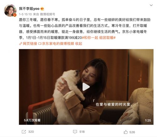 萧瑟的冬季,人们不只要忍受寒冷的侵袭,内心也常常感到冷落和孤单。而一些美好的人和事物能够让我们冰凉的内心感受到温暖与慰藉。京东小家电暖冬季通过温馨十足的主题实拍海报,向大家传播发自内心的温暖正能量。与家人团圆的相聚时光、有萌宠相伴的独居时光、和好友一起嗨皮的欢乐时光......这些愉快美好的生活时常都能让我们的内心暖意流淌,有这些美好的人和事物的陪伴,加上取暖神器为我们带来的温暖氛围,让大家感受到生活的舒适与惬意。主题海报上线新浪微博,契合用户感知的主题深受大家的赞扬和认同,被许多用户转发和讨论,展现出京东小家电主题营销活动对于用户体验的关心,和其中更深层次的,对于暖心正能量的传播。