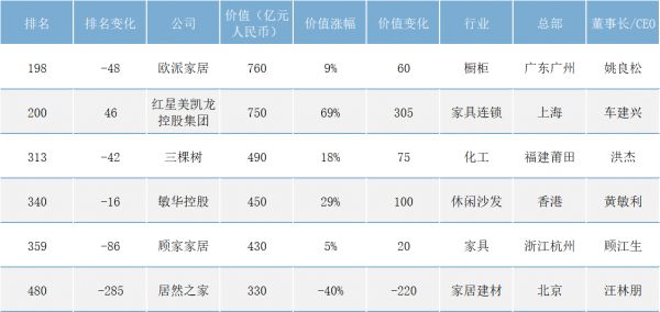 家居建材领域,欧派家居以760亿元价值排榜单第198名;紧随其后的是红星美凯龙控股集团,以750亿元价值排第200名。软体家具的两大巨头敏华控股、顾家家居也在榜单之中。敏华控股排第340位,价值450亿元;顾家家居价值430亿元,排名第359位。