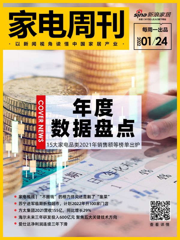 15大家电品类2021年销售额等数据出炉;家电视线 | “不圈钱”的格力终究还是割了“韭菜”;苏宁进军临期折扣超市,计划2022年开100家门店;方太集团2021营收155亿,同比增长29%;海尔未来三年研发投入600亿元 聚焦五大关键技术方向;爱仕达净利润连续三年下滑……一周精彩新闻全在新浪家居家电周刊,不容错过。