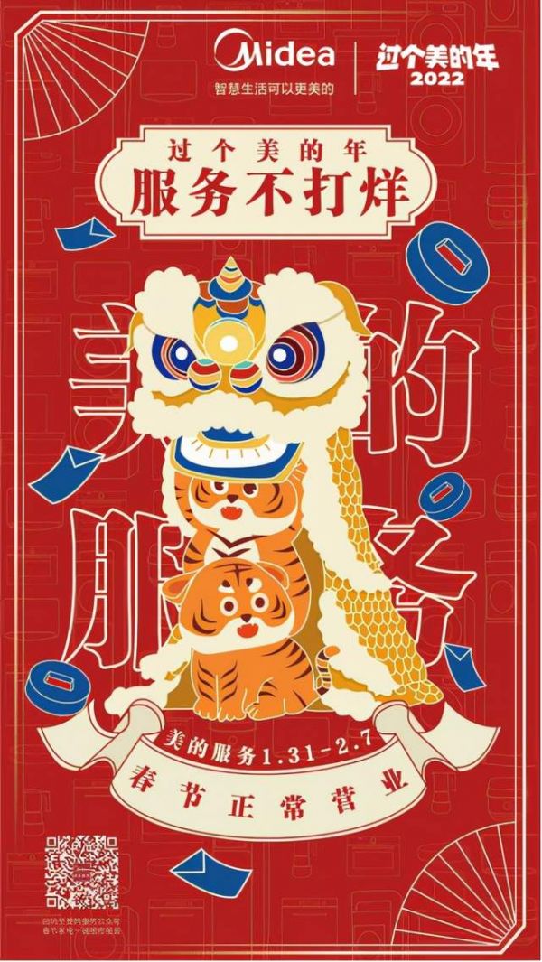 美的在全国人民欢度春节期间仍提供品质服务,2022年1月31日-2月7日(农历腊月三十至正月初七)正常受理用户服务请求,确保用户春节期间正常享受产品安装、维修、深度清洗等服务,并按照服务规范及标准开展服务工作,让用户轻松惬意过个爽快的新年。