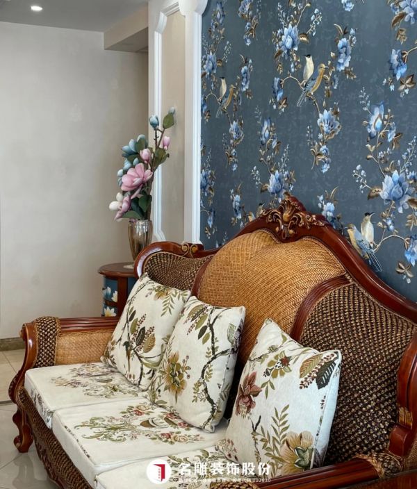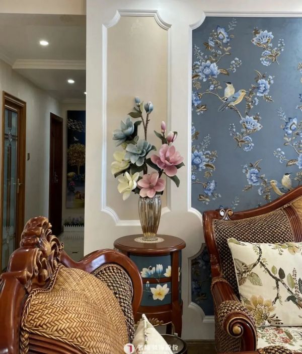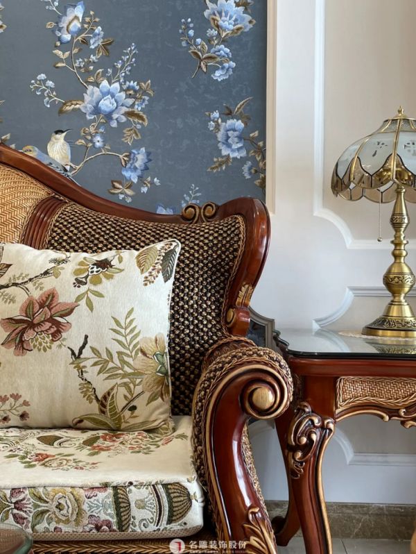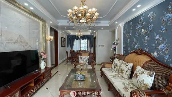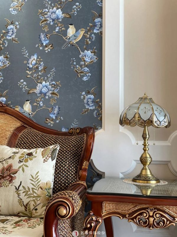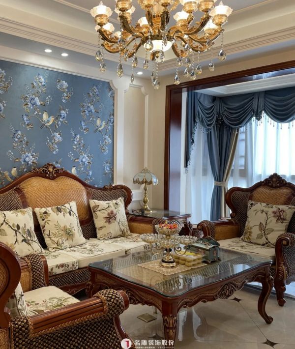 客厅,沙发背景墙以雾蓝色的花鸟壁纸打底、厚重华丽的同色系窗帘、轻奢的水晶吊灯,复古装饰元素展现美式风格的低调轻奢。