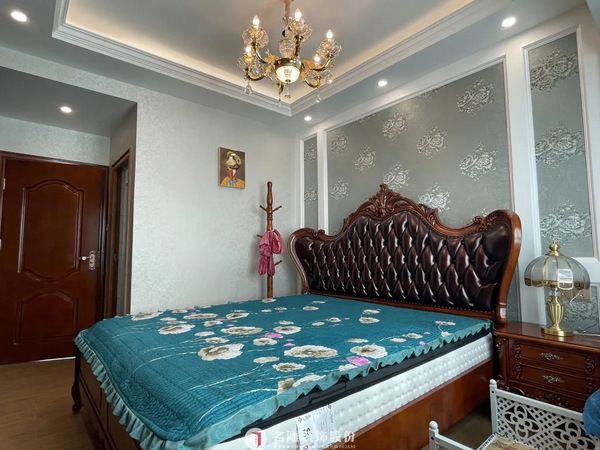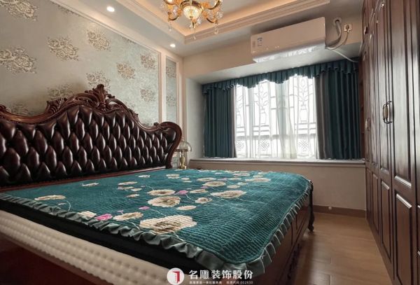 主卧,皮质床板立体的雕刻纹理塑造空间质感,石膏线搭配浅绿色系壁纸床头背景墙增添空间活力。