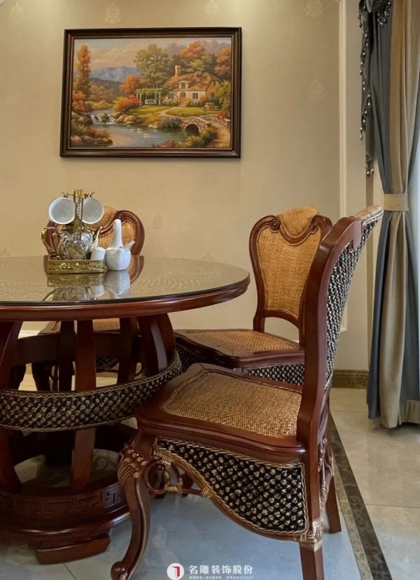 餐厅设计简单优雅,一张复古圆桌,素雅别致的金色镶边餐具,立即提升用餐格调。