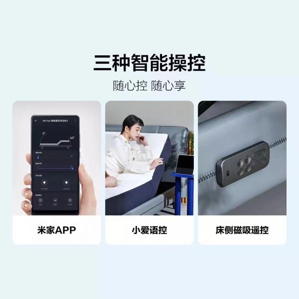 多功能可升降的智能电动床,能躺能睡能娱乐,时尚高颜值,时下不少年轻人选择智能电动床。趣睡科技之前曾推出多款智能电动床、智能床垫、智能乳胶枕、智能腰靠、智能鞋柜等智能类产品。最近小米有品上线8HFeel真皮智能电动床X,为趣睡科技智能家居又添一新品,6899元起,有三种床垫搭配零度绵床垫、弹簧护脊床垫、纯乳胶床垫。