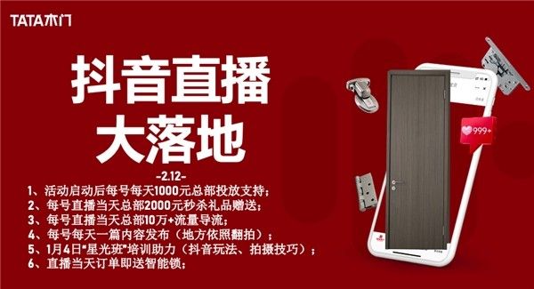 经过几天线上的预热,“开门红”活动受到了更多关注。早在1月4日线下活动开启之时,TATA木门就特意为线上活动做了充实的准备,招募全国上百名主播,在总部进行专业培训,通过全国抖音联动,进一步发酵声量,并成立了《星光班》,让整个营销活动更系统更直观更规范。