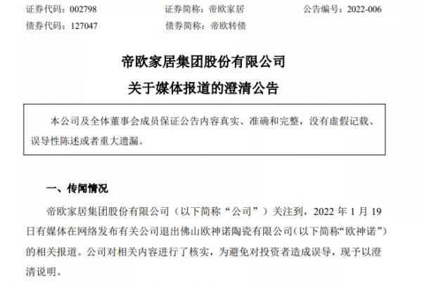 2022年1月19日,帝欧家居发布公告称,个别媒体发布了题为《帝欧家居退出欧神诺陶瓷,退出前持股比例99.99%》的报道,该报道属不实信息。截止2022年1月19日,欧神诺注册资本为 25,148.1805 万元,帝欧家居出资金额为25,147.1023 万元,持股比例为 99.9957%,欧神诺为帝欧家居控股子公司。