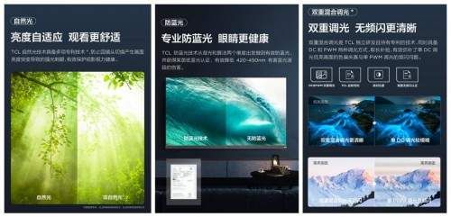 TCL电视对消费者视力也做到了无微不至地关怀,S12金标剧院电视支持全生态HDR,可完美欣赏HDR视频,让视频中的亮部更亮、暗部更暗,并尽可能地保留画面细节。然而过亮或过暗的屏幕都可能损害视力,TCL三管齐下:一是使用专利自然光技术自动调节屏幕亮度,始终保持画面亮度舒适健康;二是通过背光和算法两方面结合控制蓝光,有效降低420-450nm波段蓝光的视觉伤害,已通过莱茵防蓝光专业认证;三是采用独立研发的双重混合调光技术,让电视同时具备DC和PWM两种调光方式,取长补短,有效弥补DC调光低亮度画面色彩失真和PWM调光频闪问题。