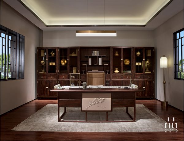 新中式品牌“和砚·品”推出了一款名为“品德”的书房家具,在传承文化的同时也结合了现代流行元素。书桌采用传统条案的型制,宁静大气。前档的软包装饰,刻有奔跑的骏马图案及“一马当先”字样,栩栩如生。椅子设计新颖,结合中国传统韵味与现代流行元素,中式的四出头官帽椅造型搭配欧式城堡造型,材料上使用稀有的木材配上牛皮,加上软包的填充,更加符合人体工学,为坐垫提供了极强的舒适性。爱马仕橙的皮色,将现代时尚的质感展露无遗。一木一皮,是传统与时尚的结合。书柜具有开放式、封闭式两种储纳方式,带来满足日常居住的便利。