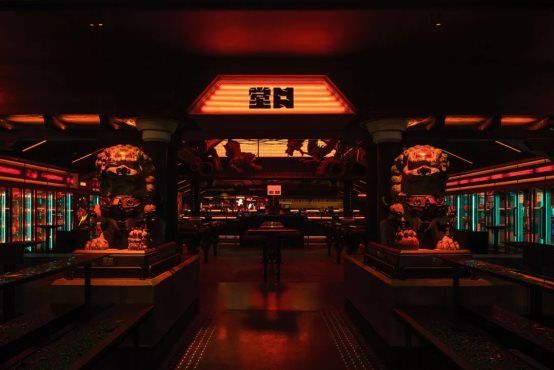 古建筑的构架上大量使用了体现现代科技的材料和灯光,在外立面的大面积透明LED屏幕,让在屏幕后面跑动的灯带隐隐约约显露出来,通场使用的灯条根据时间段变色,让东方感更具神秘性,同时对应功能至上的cyber世界中随处可见的全息影像。碰撞融合的表现形式打破了常规“传统”或“未来”给人的固定印象,并创造了独特并多重的体验感。