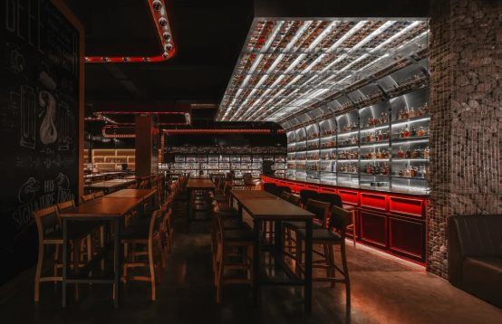 BEEER PARK酒吧,整个酒吧以红灯营造出一种神秘的氛围,不仅让人警觉,但也吸引着人们不由自主地接近。在这个酒吧里,一场属于酒精的海天酒宴即将上演。酒吧整体灯光昏暗,但进入大门后,冷艳的红色油漆柜台和红色灯光犹如拉丁舞者的红色高跟鞋,顿时映入人们的眼帘,产生了巨大的冲击力。斑驳的红砖、木质桌子和高凳,加上底部冷红色和黑色的完美结合,构成了这个美式复古品酒空间。