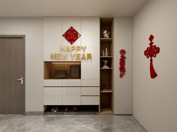 玄关处,到顶的鞋柜满足了进门的储物需求,白色+木色搭配,大气整洁。贴上福字、挂上中国结,新春的年味儿扑面而来。