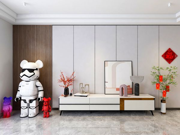 本次选用的户型,打通书房、阳台、客餐厅,可以说是真正的意义上的开放式大户型,通透而高级,但稍不注意容易显冷清。为了解决这一大痛点,玉兰设计师运用白色+木色的艺术墙板,搭配圆融弧度家具,削减大户型的高冷感。并加入各种春天、新年元素的饰品摆件,直线拉高空间的视觉温度。