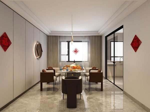 新春家宴作为高规格的家族礼遇,餐厅的布置自然也不容忽视。墙面延续客厅的艺术墙板造型,提升空间的整体性。餐椅圆融而富有设计感,合围式摆放,利于家人餐间交流,打造其乐融融的用餐时光。