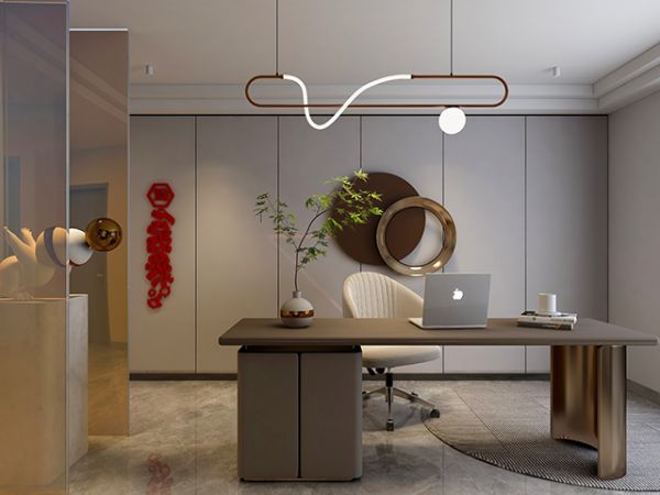 与客餐厅打通的书房,是为会客之余开辟的一处安静场域。艺术灯具线条流畅,南天竹清新雅致,佳节闲暇,于此看书磨墨再合适不过。