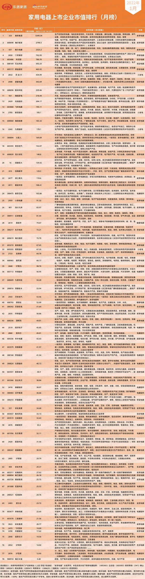 为研究中国家电行业上市企业股票市值,新浪家居家电事业部推出《家用电器上市企业市值排行(月榜)》,以供参考。